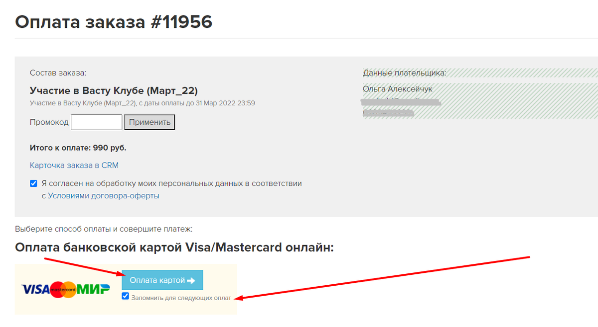 Перед тем, как нажать кнопку "Оплата картой", убедитесь, что у вас стоит галочка напротив надписи "Запомнить для следующих оплат".